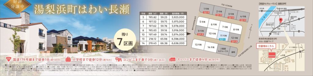 | 所在地 | 湯梨浜町はわい長瀬⑤714-7/⑥714-8/⑦714-9/⑧714-10⑩714-12/⑬714-15/⑭714-16 https://goo.gl/maps/FeMTzXd499t7EB5e9 |
