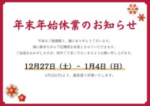 誠に勝手ながら、12月27日(土)から1月4日(日)までの間を休業日とさせていただきます。